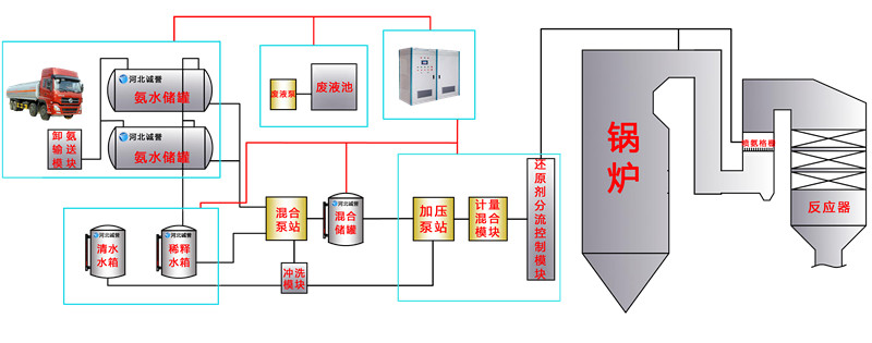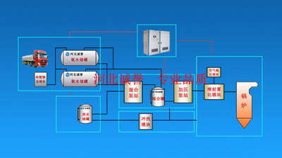 液體罐車運(yùn)送濃度20%-30%的氨水至水泥廠,泵送到儲(chǔ)存罐中供脫硝使用。脫硝時(shí),氨水經(jīng)泵站加壓稀釋后,通過(guò)管道輸送到脫硝噴槍的脫硝噴頭內(nèi),氨水溶液經(jīng)過(guò)脫硝噴頭霧化后直接噴入水泥窯尾分解爐內(nèi),氨氣與NOX反應(yīng)后生成氮?dú)庵苯优?.