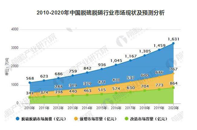 當前,煙氣除塵、脫硫、脫硝是大氣污染治理的三大業(yè)務(wù)板塊,據(jù)前瞻產(chǎn)業(yè)研究院發(fā)布的《大氣污染治理行業(yè)市場前瞻與投資戰(zhàn)略規(guī)劃分析報告》統(tǒng)計數(shù)據(jù)顯示,2015年,我國脫硫脫硝行業(yè)需求規(guī)模超過900億元,其中新增市場容量超過400億元,改造市場容量超過500億元,且隨著國家大氣污染法規(guī)標準越來越嚴格,未來5-10年將是中國大氣污染治理的重點時期,市場容量將繼續(xù)保持在10%左右的增幅。