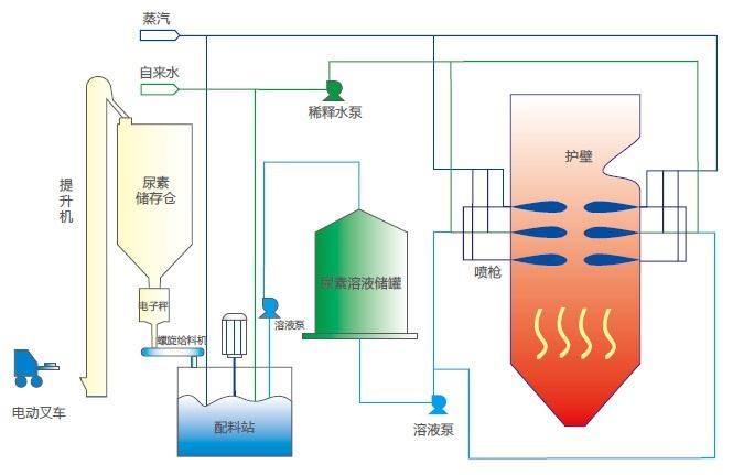 SNCR脫硝系統(tǒng)是將NH3、尿素等還原劑噴入鍋爐爐內(nèi)與NOx進行選擇性反應,不用催化劑,因此必須在高溫區(qū)加入還原劑。還原劑噴入爐膛溫度為850~1100℃的區(qū)域,迅速熱分解成NH3,與煙氣中的NOx反應生成N2和水,該技術(shù)以爐膛為反應器。我公司設計的SNCR煙氣脫硝技術(shù)的脫硝效率一般為60%,采用尿素或者氨水作為還原劑。其特點為: